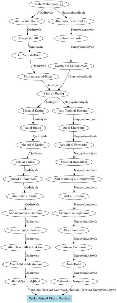 - Tarekat Qadiriyah — bersambung kepada Syekh Abdul Qadir al-Jilani, sang sulthanul auliya.